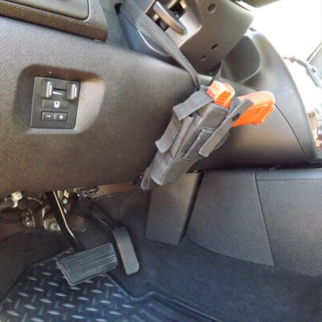 Easily attaches to your steering console for quick access to your firearm, mace, flashlight, and other items right under your steering wheel, ensuring easy and quick access when needed. Holster not included.